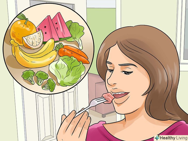 Збагатите свій раціон овочами і фруктами.наприклад, на сніданок з'їдайте фруктовий смузі, на обід – салат, а ввечері урізноманітніть свою вечерю листовими овочами, такими як брокколі і шпинат, або солодкою картоплею. Можна також вранці з'їдати моркву, запиваючи її теплою водою з соком лимона.[15]- Ви можете додати в свій раціон і таку легку і в той же час багату харчовими волокнами закуску, як чорнослив. Цей продукт прискорює травлення і має проносну дію.