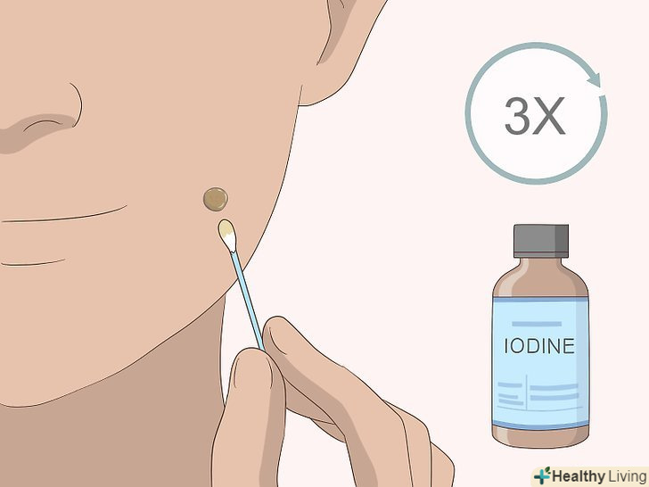 Використовуйте йод.це хороший варіант для людей з більш чутливою шкірою, так як не буде такого печіння, як при використанні яблучного оцту або часнику. Наносите йод безпосередньо на родимку за допомогою ватної палички до трьох разів на день. Продовжуйте робити це кожен день, поки ви не побачите помітне поліпшення.