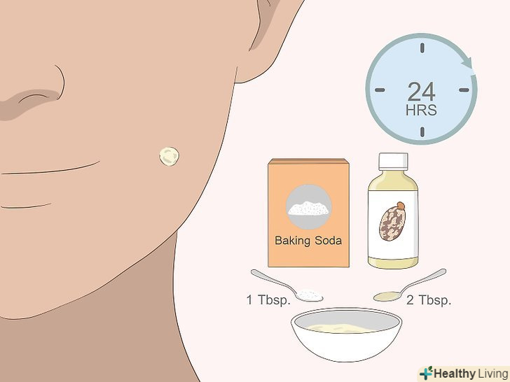 Спробуйте касторове масло і соду.змішайте пасту з однієї столової ложки соди і двох столових ложок касторової олії. Нанесіть невелику кількість суміші безпосередньо на родимку і залиште на кілька годин або на ніч, а потім змийте.