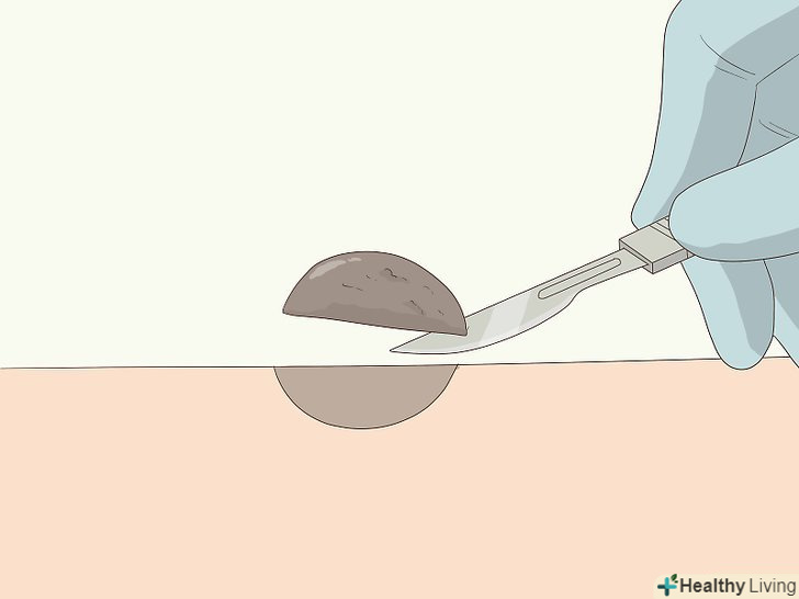 Видалення родимки простим вирізанням.цей тип видалення найкраще підходить для поверхневих родимок, які або видаляються хірургічними ножицями, або збриваються за допомогою скальпеля.[2]- Спочатку хірург вирізає родимку, щоб на шкірі не було опуклості.