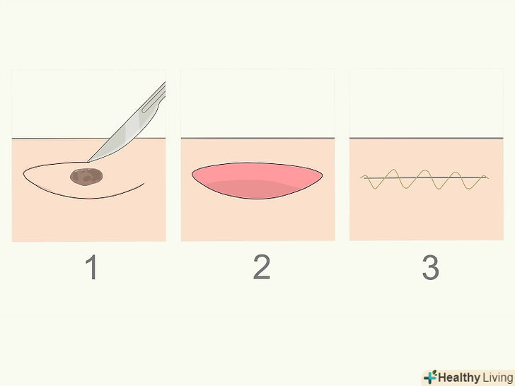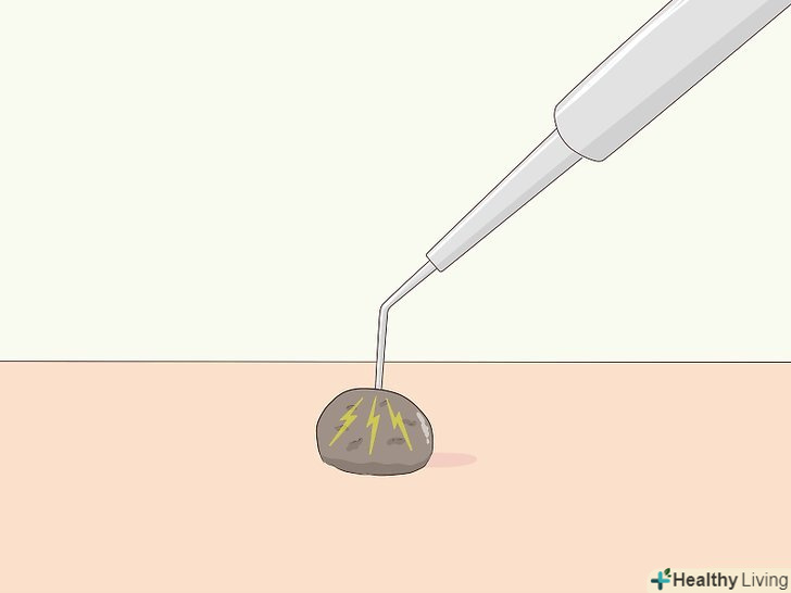 Видалення за допомогою електрокоагуляції, або випалювання.електрокоагуляція спалює родимку, впливаючи на неї електричним струмом. Процедура руйнує тканину родимки протягом декількох сеансів. При використанні цього способу немає необхідності накладати шви, так як електрика припікає рану. При цьому способі не залишиться зразка тканини, який можна було б відправити в лабораторію для дослідження на рак.- Деякі клініки також пропонують видалити родимки за допомогою радіохірургії (радіочастотних хвиль) і лазера. Обидві ці процедури діють за принципом випалювання тканини родимки.