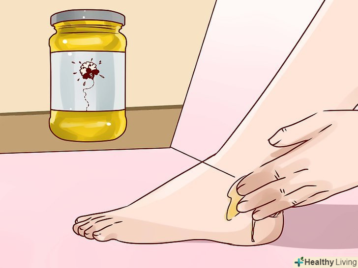 Масажними рухами втирайте трохи меду.завдяки тому, що мед діє як натуральний зволожуючий засіб, він зменшить розмір шрамів і знебарвлених ділянок на шкірі. Хорошим вибором для медичних цілей є мед манука і мед дерева туаланг, але знайти ці різновиди меду можна тільки в магазині здорової їжі або в Інтернеті.[6]- Нанесіть тонкий шар меду, а потім протягом 5-10 хвилин розтирайте його по шкірі.