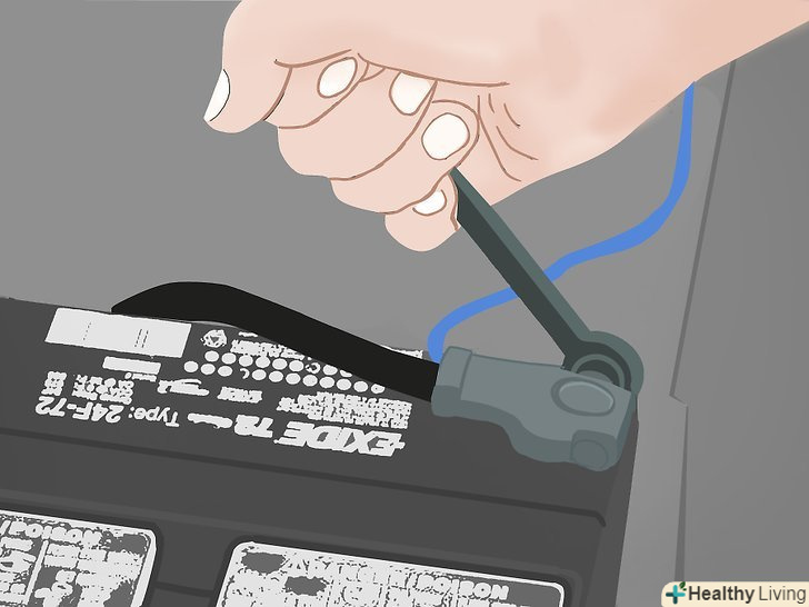 Вимкніть акумулятор.двигун не потрібно буде включати до завершення роботи, тому слід відключити негативну клему акумулятора. Зніміть кабель з негативного затиску, щоб двигун не включився під час заміни фільтра. Вручну або за допомогою ключа послабте гайку, яка утримує кабель на негативній клемі (не потрібно знімати гайку повністю).[7]- Вимкніть акумулятор, щоб двигун не включився під час заміни фільтра.