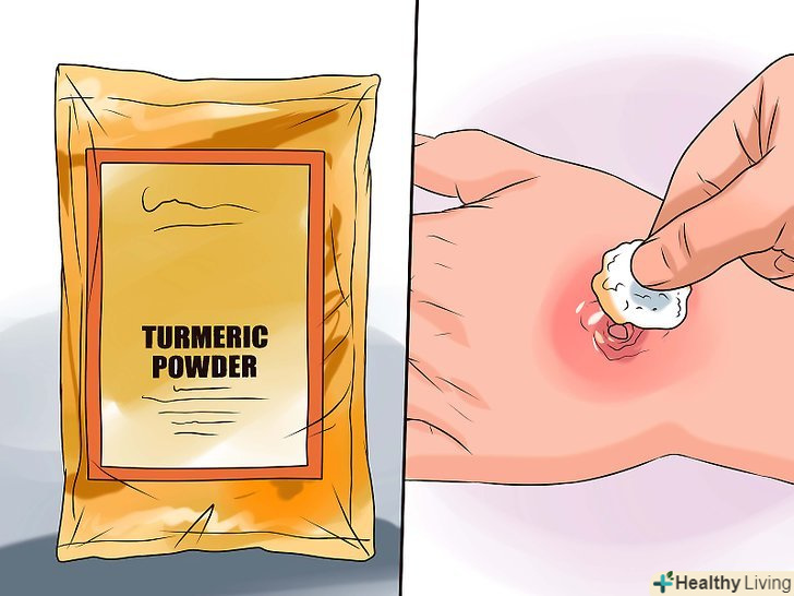 Використовуйте куркуму.куркума є основним інгредієнтом каррі. Вона володіє як протимікробними, так і протизапальними властивостями.[10] Куркуму можна використовувати у вигляді порошку або ефірного масла. Якщо ви використовуєте порошок куркуми, змішайте ½ чайної ложки (близько 1,5 грама) куркуми з 1-2 столовими ложками (15-30 мілілітрах) касторової олії, так щоб вийшла пастоподібна маса. Нанесіть отриману пасту прямо на нарив і прикрийте його бинтом. Заново наносите пасту і міняйте бинт кожні 12 годин.- Якщо ви використовуєте ефірне масло, нанесіть його безпосередньо на нарив за допомогою ватної палички або ватного кульки.