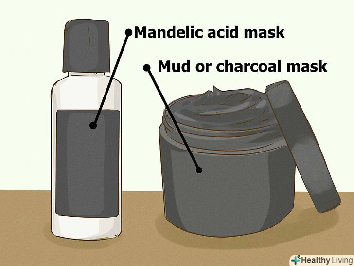 Нанесіть спеціальну маску. Вам потрібна маска з бруду або деревного вугілля, можна спробувати і маску, що містить мигдальну кислоту.- Маска з бруду або деревного вугілля. Втирайте цю маску двічі на тиждень, потім змивайте. Така маска очистить область нанесення і розкупорить пори.[3]