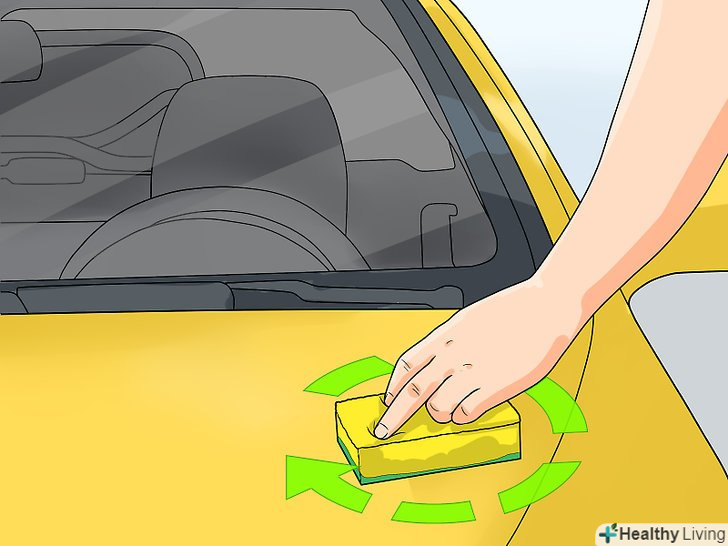 Протріть губкою аерозольну фарбу.притисніть губку до пофарбованої ділянки авто і протріть його круговими рухами. Зітріть всі сліди фарби, включаючи видалені бризки або краплі. Переверніть губку або візьміть нову, коли її поверхня покриється аерозольною фарбою.[14]