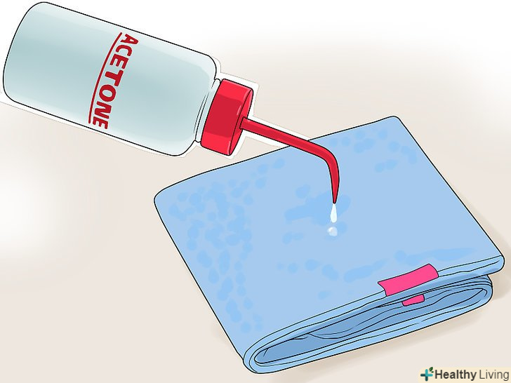 Налийте ацетон або рідину для зняття лаку на тканину.Візьміть махровий рушник або рушник з мікрофібри, щоб не подряпати прозорий шар або шар фарби на авто. Тканина повинна весь час бути мокрою, тому, якщо вона почне висихати, додайте ще ацетону або рідини для зняття лаку.[2]- Одягніть рукавички, щоб захистити руки від ацетону або рідини для зняття лаку і фарби.