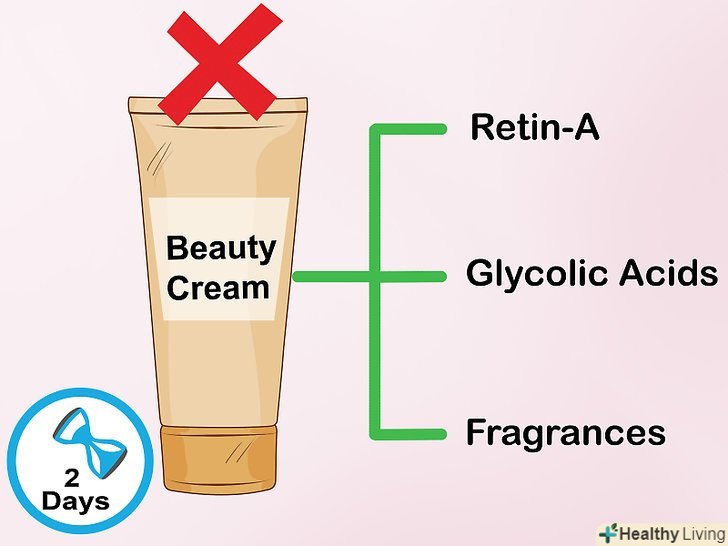Уникайте косметичних процедур, які можуть викликати подразнення шкіри.воскову епіляцію на областях, що зазнали мікродермабразії, робіть не раніше, ніж через тиждень. Перевірте засоби для догляду за шкірою на вміст третиніону, гліколевих кислот, ароматизаторів та/або високий вміст спирту. Хоча б протягом двох днів після процедури не використовуйте засоби з цими інгредієнтами.[3]- Протягом одного тижня постарайтеся не користуватися агресивними хімічними речовинами. Також 2-3 дні уникайте наносити макіяж. Можете зробити макіяж очей і губ, але відмовтеся від тональної основи і пудри.