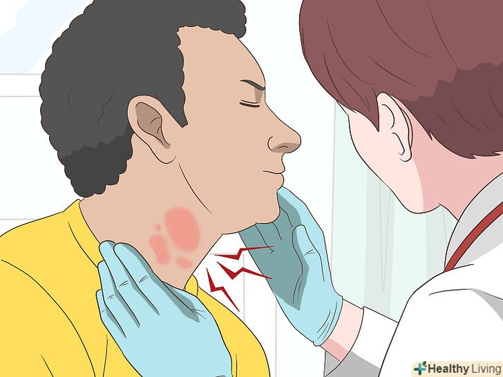 Зверніться до лікаря-дерматолога, якщо висип болюча, набрякла або гаряча на дотик.такий стан може бути ознакою того, що висип інфікована, або у вас розвинулася серйозна проблема зі шкірою. І також ви повинні звернутися до лікаря, якщо у вас з'являється лихоманка, біль у грудях або проблеми з диханням.[13]- Лікар-дерматолог огляне шкіру, щоб визначити причину. Ще він може взяти зразок вашої шкіри, щоб визначити причину поточного стану шкіри.