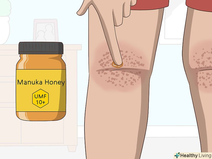 Використовуйте мед манука проти сухої шкіри або екземи.мед манука має антибактеріальні та протизапальні властивості. Він більш дієвий, ніж інші види меду, і може допомогти вилікувати сухість шкіри або екзему. Нанесіть мед на шкіру чистими пальцями і дайте йому висохнути. Повторюйте кілька разів на день, щоб допомогти ділянці шкіри зажити швидше.[16]- Шукайте мед з унікальним Манука Фактором (UMF) від 10 і вище. Мед манука можна купити в Інтернеті.