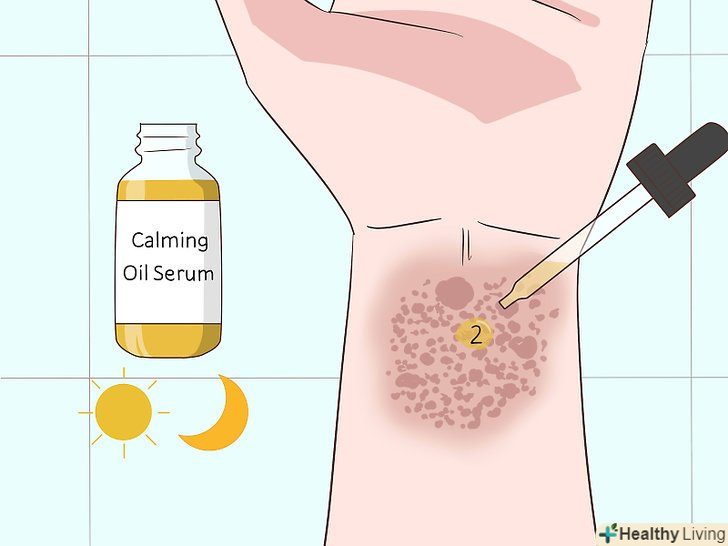 Наносите заспокійливу олію-сироватку на суху шкіру.масла-сироватки містять загоюють інгредієнти і допомагають заспокоїти шкіру і зменшити набряк або роздратування. Заспокійливу олію-сироватку можна купити в місцевій аптеці або в Інтернеті. Наносите 1-2 крапельки масла-сироватки на шкіру 1-2 рази на день, бажано вранці і ввечері.[17]- Переконайтеся, що масло-сироватка не містить ароматизаторів, агресивних або штучних інгредієнтів, оскільки вони можуть викликати роздратування шкіри.