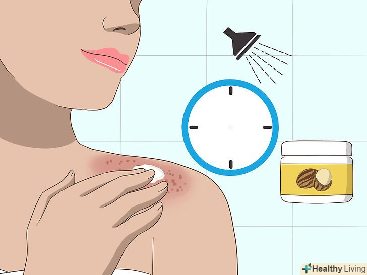 Наносите зволожуючий засіб відразу після прийняття душу або ванни.Насухо промокніть шкіру тіла рушником і відразу нанесіть заспокійливий зволожуючий засіб. Так ви утримаєте вологу в шкірі і уникнете її сухість. Використовуйте зволожуючий засіб, який містить натуральні інгредієнти, наприклад, масло ши, овес і ефірні масла (оливкова або жожоба).[19]- Зволожуючі засоби з мінеральними маслами, молочною кислотою і ланоліном також можуть допомогти загоєнню шкіри.