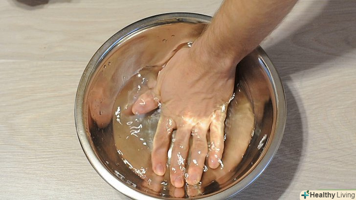 - Занурте руки в миску зі спиртом, щоб швидко вгамувати печіння.вилийте склянку (240 мл) спирту в миску і занурте в нього руки. Ретельно розітріть руки, щоб спирт покрив всю поверхню рук і зап'ястя.[4]