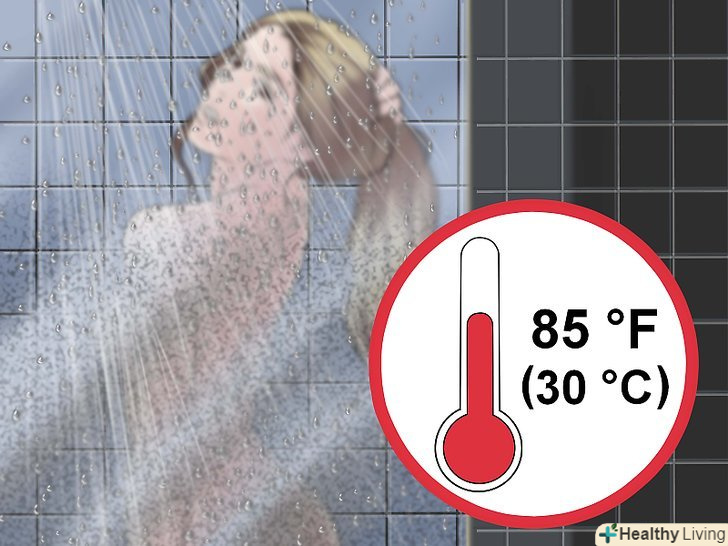 Прийміть ванну або душ в ледь теплій воді.під "ледь теплою" мається на увазі вода температурою 30 °C. прийом ванни є кращим завдяки повному зануренню тіла в воду, але якщо у вас немає ванної, зійде і душ.[4]- Не приймайте ванну або душ у крижаній воді.