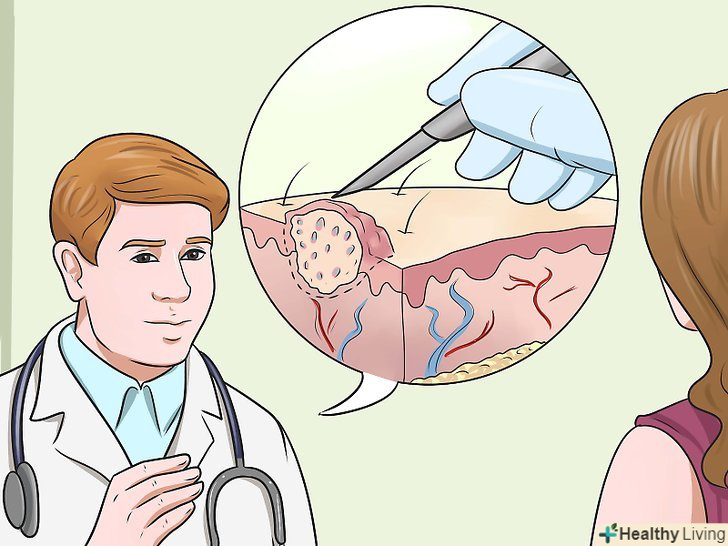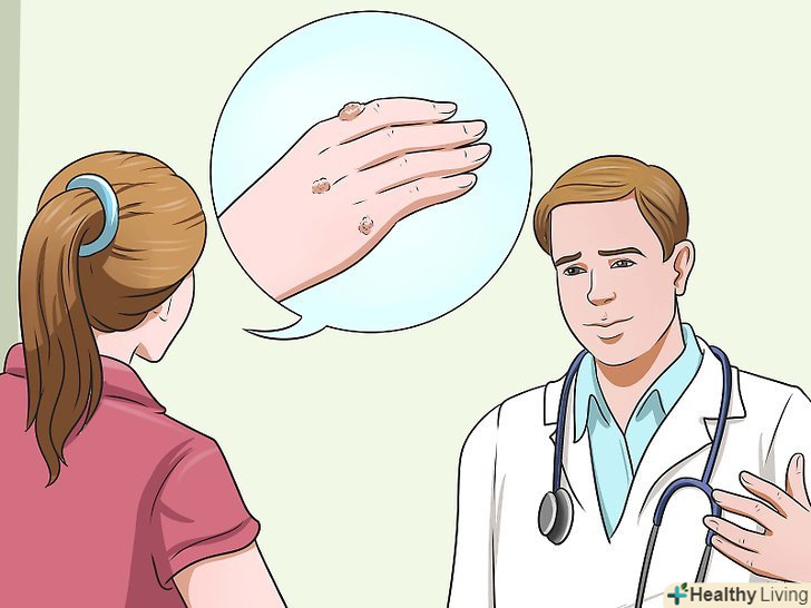 Проконсультуйтеся з лікарем.якщо бородавка на долоні не зникла сама по собі або після використання наведених вище домашніх засобів, запишіться на прийом до лікаря. Особливо це варто зробити в тому випадку, якщо бородавка болить або розташована в самому невідповідному місці. Лікар огляне вашу долоню і переконається в тому, що це всього лише бородавка, а не будь-яке інше шкірне захворювання. За зовнішнім виглядом бородавки можуть нагадувати такі проблеми зі шкірою, як мозолі, кісткові мозолі, родимки, врослі в шкіру волосся, вугри, пухирі, себорейний кератоз, червоний плоский лишай, плоскоклітинна карцинома.[14] щоб переконатися, що це не що-небудь більш серйозне, наприклад рак шкіри, лікар може провести біопсію, тобто взяти зразок тканини і досліджувати його під мікроскопом.- Якщо виявиться, що у вас на долоні не бородавка, лікар може направити вас до фахівця із захворювань шкіри (дерматолога), який призначить лікування.