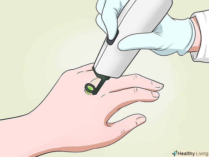 Подумайте про можливість лазерної терапії.технології, що розвиваються, надали медикам ще один ефективний засіб вивести такі шкірні дефекти, як бородавки. Наприклад, за допомогою імпульсного лазера на барвнику можна випалити і зруйнувати (або припекти) крихітні кровоносні судини, які оточують бородавку і підживлюють її, в результаті чого бородавка відмирає і відпадає.[17] іншими, більш традиційними видами лазерів можна за лічені хвилини випалити саму бородавку, хоча в цьому випадку буде потрібно місцева анестезія. Дана процедура не вимагає госпіталізації і викликає лише легке роздратування навколишньої шкіри.- Використання імпульсних лазерів на барвниках призводить до успіху в 95% випадків для всіх видів бородавок, і вони дуже рідко з'являються знову.