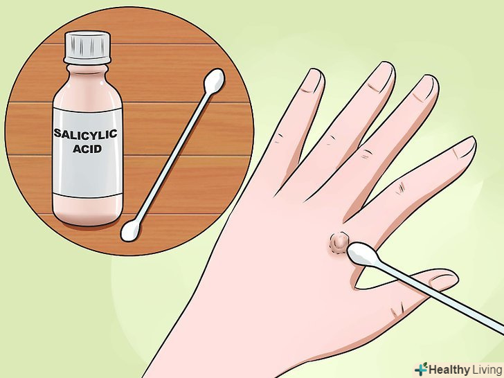 Нанесіть на бородавку саліцилову кислоту.ще один спосіб видалити верхні шари бородавки полягає у використанні саліцилової кислоти. Ця кислота розчиняє білок кератин, з якого складаються ущільнені верхні шари бородавки.[3] однак саліцилова кислота може пошкодити здорову шкіру навколо бородавки або викликати її роздратування, тому будьте обережні і наносите рідину, мазь, гель або пластир з кислотою не частіше двох разів на день. Перш ніж наносити саліцилову кислоту, змочіть шкіру теплою водою і потріть бородавку пемзою або пилкою для нігтів, як описано вище — після цього кислота проникне глибше. Для більшого ефекту накладіть пов'язку на ніч. Виведення великої бородавки за допомогою саліцилової кислоти може зайняти не один тиждень, так що наберіться терпіння.- Саліцилову кислоту і препарати з нею для виведення бородавок можна придбати без рецепта в найближчій аптеці. Деякі засоби містять також дихлороксусную і трихлороксусную кислоти, які випалюють бородавки.