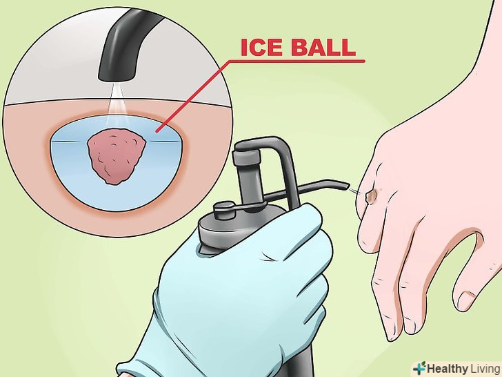 Спробуйте використовувати кріотерапію.при кріотерапії (лікуванні холодом) бородавки виморожуються. Цю поширену процедуру виведення бородавок часто використовують терапевти і дерматологи, і існують відпускаються без рецепта кошти з рідким азотом (наприклад, Кріофарма або Dr. Scholl's Freeze Away), якими можна користуватися самостійно в домашніх умовах.[5] після нанесення рідкого азоту на бородавку утворюється пухир, а потім приблизно через тиждень він відпадає разом з бородавкою. Необхідні повторні процедури, щоб бородавка не виросла знову. Щоб лікування рідким азотом було більш ефективним, перед його нанесенням потріть бородавку пемзою або пилкою для нігтів.- Кріотерапія може викликати незначний біль. У разі сильного болю припиніть процедури і зверніться до лікаря.