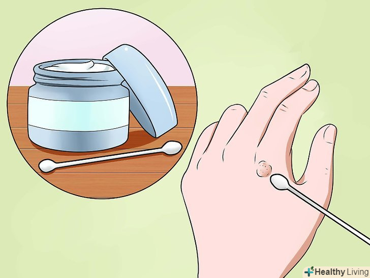 Використовуйте мазі.існує безліч відпускаються без рецепта мазей, які допомагають позбутися від бородавок, і їх застосування зазвичай менш болісно, ніж кріотерапія. Ці мазі руйнують структуру бородавок на хімічному рівні і повністю виводять бородавки. Як правило, до їх складу входять дихлороксусная і трихлороксусная кислоти, 5-фторурацил, оксид цинку або невелика кількість будь-якого ретиноїду (похідна вітаміну A).[6] нанесіть мазь на бородавку на долоні, розітріть її і почекайте близько п'яти хвилин, поки вона вбереться, після чого помийте руки.- Замість мазі можна використовувати тампони від бородавок. Вони діють подібно мазей. Можна протерти лікувальним тампоном бородавку, або помістити на неї невеликий шматочок тампона приблизно на годину і закріпити його на місці за допомогою медичного пластиру або липкого бинта.