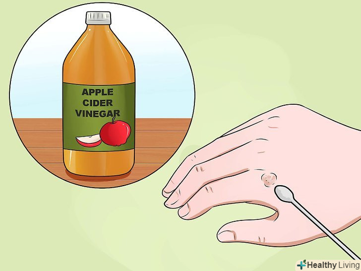 Використовуйте яблучний оцет.яблучний оцет здавна є домашнім засобом, яке застосовують для видалення з шкіри різних дефектів, в тому числі бородавок. Оцет містить лимонну кислоту і велику кількість оцтової кислоти. Ці кислоти мають антивірусну дію (вони вбивають ВПЛ і деякі інші віруси).[9] однак лимонна і оцтова кислота можуть також дратувати здорову шкіру, тому будьте обережні. Спробуйте змочити в оцті ватяну кульку або ватяну паличку і обережно нанести його на вершину бородавки, після чого прикрийте бородавку на ніч бинтом. Повторюйте цю процедуру кожен день. Приблизно через тиждень бородавка повинна потемніти, а потім і відпасти. Незабаром це місце затягнеться здоровою шкірою.- Спочатку яблучний оцет може викликати легке печіння або невеликий набряк шкіри навколо бородавки, але незабаром ці симптоми зазвичай проходять.