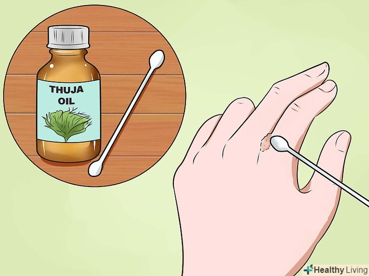 Подумайте про використання масла туї.масло туї отримують з хвої і коренів туї складчастої (канадського червоного кедра). Це стародавнє аюрведичний засіб використовується для лікування багатьох захворювань завдяки своїм сильним антивірусним властивостям — в ньому містяться сполуки, які стимулюють імунну систему і допомагають тим самим знищити віруси, в тому числі ВПЛ.[12] тому масло туї можна використовувати для виведення бородавок всіх типів. Нанесіть масло туї безпосередньо на бородавку і почекайте близько 5 хвилин, поки воно вбереться, після чого прикрийте бородавку бинтом. Повторюйте процедуру двічі на день протягом 2 тижнів. Масло туї має сильну дію і може легко викликати роздратування навколишньої шкіри, так що будьте обережні.- Щоб зменшити ризик подразнення шкіри, спробуйте перед нанесенням розвести масло туї невеликою кількістю мінерального масла або риб'ячого жиру.