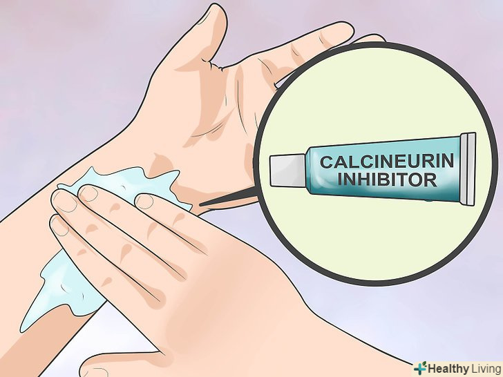 Використовуйте крем з інгібіторами кальциневрину, який сприяє загоєнню шкіри.якщо не допомагають інші засоби, використовуйте крем з інгібітором кальциневрину. Подібні препарати, до яких відносяться такролімус ("Протопік") і пімекролімус ("Елідел"), підтримують здоров'я шкіри, знімають свербіж і пом'якшують спалахи бульбашкового дерматиту.- Інгібітори кальциневрину діють безпосередньо на імунну систему і можуть викликати такі побічні ефекти, як проблеми з нирками, високий артеріальний тиск і головний біль. До серйозних, але рідкісних побічних ефектів відноситься і підвищений ризик деяких форм раку.[29]