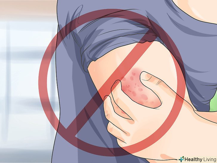 Не розчісуйте шкіру.незалежно від того яким чином ви лікуєте бульбашковий дерматит, не слід розчісувати плями на шкірі, так як це може привести до розкриття висипу і утворення виразок, що загрожує подальшими проблемами, в тому числі шкірної інфекцією.[8]- Якщо ви не можете втриматися від того, щоб не чесати роздратовані ділянки шкіри, накладайте на серйозно уражені місця пов'язку. Це допоможе вберегти шкіру від подразників і утриматися від її розчісування.[9] однак не накладайте пов'язку занадто часто, так як це може викликати додаткове роздратування.