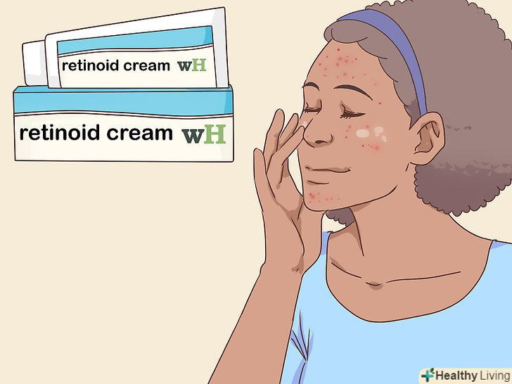 Використовуйте засіб з ретиноїдами.ретиноїди— це форми вітаміну А, які використовуються в косметиці. Вони сприяють зменшенню запалення і очищенню пір. Крім того, це відмінний засіб для лікування шрамів від вугрової висипки. Придбайте крем з ретиноїдами в місцевій аптеці.[4]- Наносите крем з ретиноїдами на суху шкіру обличчя. Робіть це через тридцять хвилин після вмивання.