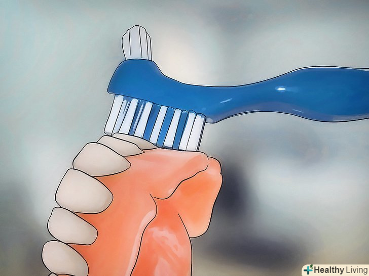 - Візьміть щітку для протезів або звичайну зубну щітку і поскребіть нею всю поверхню вставних зубів – як всередині, так і зовні. Переконайтеся, щоб щітка була мокрою, і не тріть зуби занадто сильно.[13]