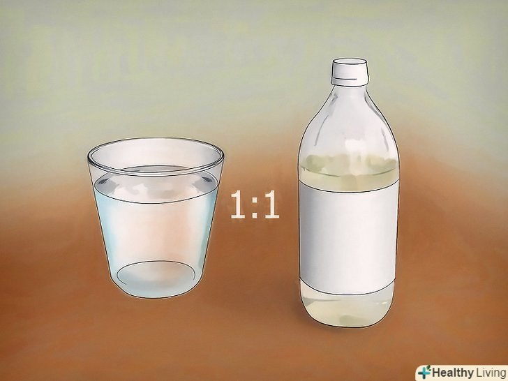Змішайте одну частину води з однією частиною оцту.змішайте в ємності для зубних протезів воду і оцет в співвідношенні 1: 1. Готової рідини повинно бути достатньо, щоб повністю покрити зубні протези.[4]- Візьміть в звичку наливати оцет і воду під час підготовки до сну, поки будете вмиватися або переодягатися в піжаму, щоб по дорозі в ліжко вам потрібно було лише опустити протези в ємність.