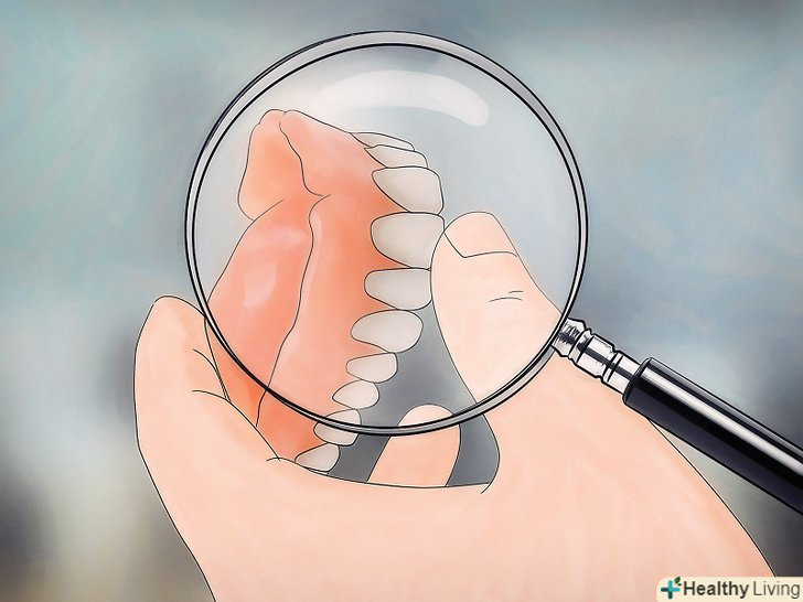 Перевірте протези на присутність розм'якшеного зубного каменю і відкладень.у більшості випадків, оцет не розчинить зубний камінь повністю, але пом'якшить його досить, щоб ви могли його вичистити на наступний ранок. Цього також буде недостатньо, щоб видалити плями, але при цьому розчин значно полегшить роботу щітці для чищення зубних протезів.[9]