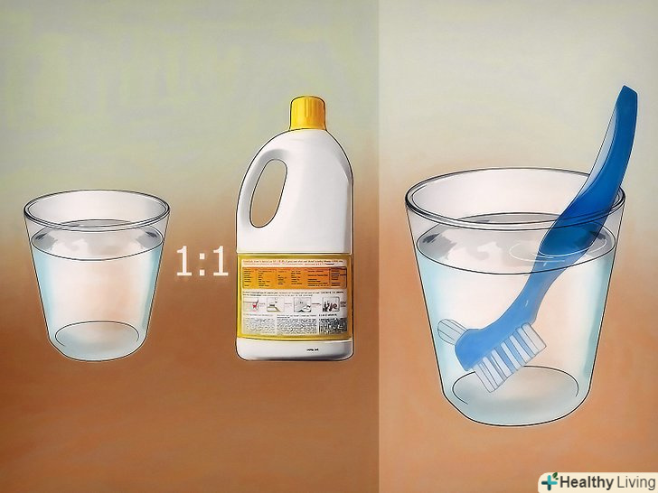 Замочіть щітку для протезів в розчині відбілювача і води.раз на тиждень замочуйте щітку для зубних протезів в половинному розчині відбілювача і води, щоб запобігти росту бактерій.[10] перш ніж використовувати щітку на зубних протезах, ретельно її прополощіть.