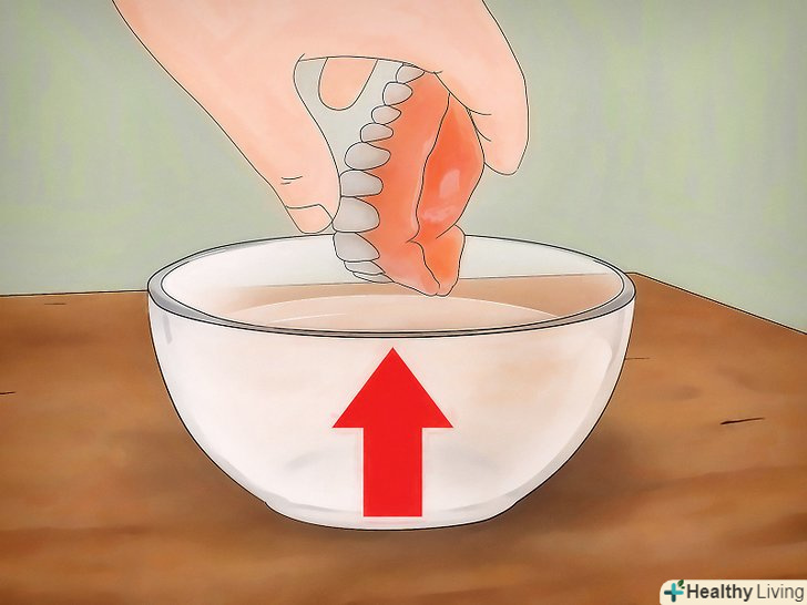Витягніть зубні протези з оцту.на наступний ранок Принесіть ємність до раковини і залийте її водою. Руками витягніть зубні протези з оцтового розчину і потримайте їх над водою. Якщо ви раптом упустите протези, вода послужить в якості амортизатора.[11]