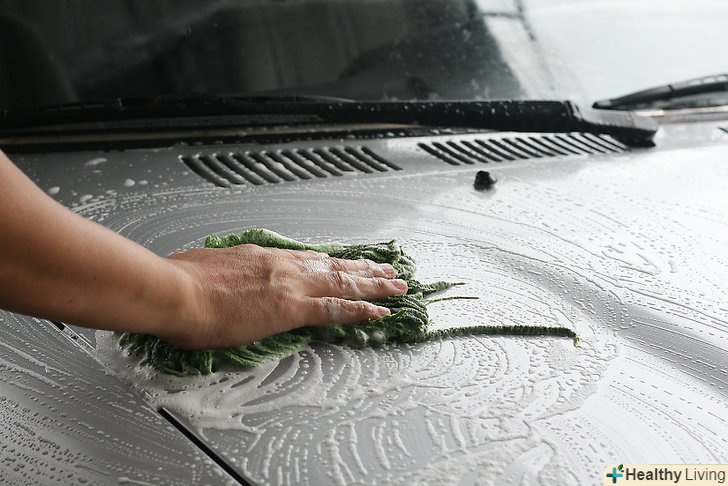 Візьміть велику губку і занурте її в мильну воду.вийміть губку і вичавіть близько половини води, помістіть губку на кузов машини і починайте мити.