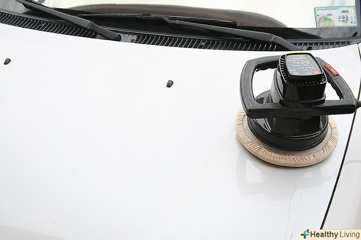 Помістіть полірувальну машинку на полірувальну суміш і робіть їй кругові рухи для рівномірного нанесення суміші.рухи повинні бути круговими і дрібними для полірування кожної ділянки автомобіля.- При використанні потужних полірувальних машинок, включіть машинку і круговими рухами втирайте суміш в поверхню до появи блиску.