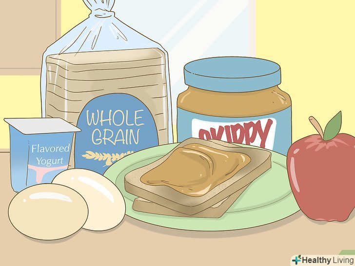 Їжте сніданок щодня.поживний сніданок бадьорить, запускає метаболізм і запобігає тягу до цукру в другій половині дня.[11] Забудьте про солодкі пончики і пластівці з молоком. Ось варіанти краще:- Цільнозерновий хліб;