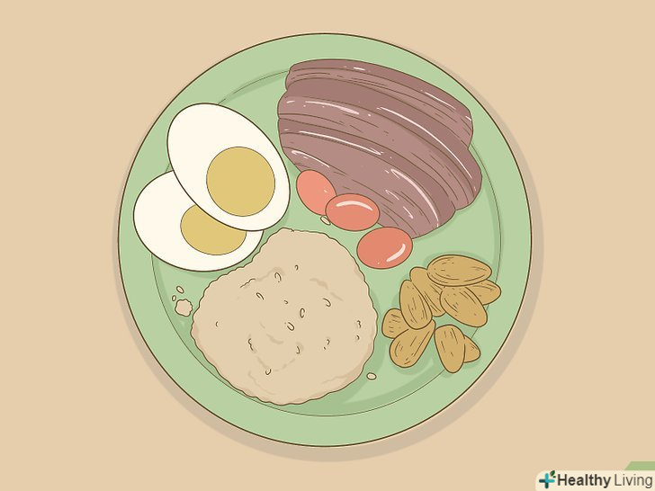 Вибирайте продукти з високим вмістом білка.споживання продуктів і перекусів з високим вмістом білка забезпечує стійкий рівень енергії. Насичені білком продукти також забезпечують організм амінокислотами, необхідними для відновлення і нарощування м'язових тканин. Ось чудові джерела білка: [12]- М'ясо птиці;