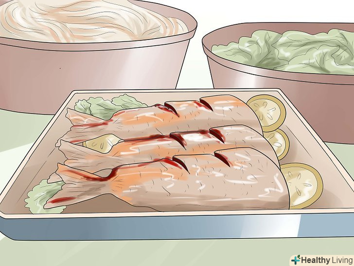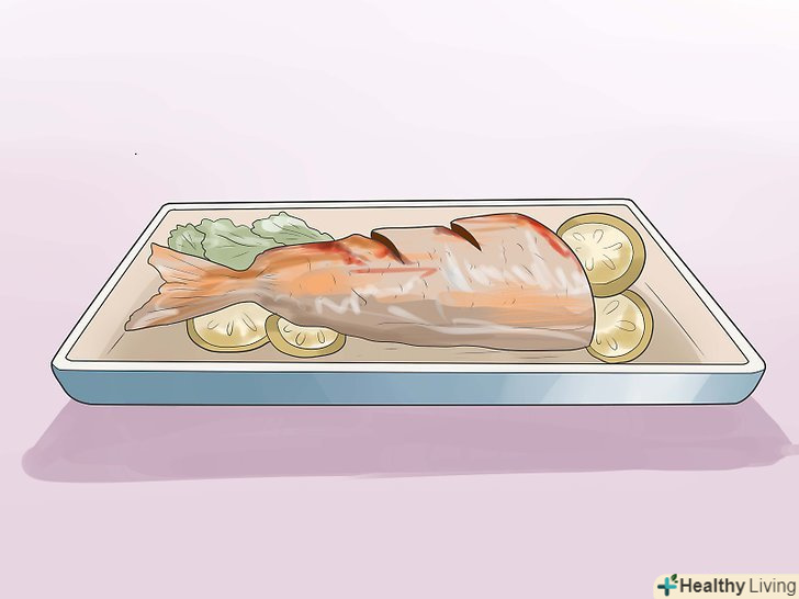 Їжте більше риби. ви повинні їсти рибу принаймні два рази на тиждень. Риба має виключно високий рівень омега-3-поліненасичених жирних кислот і поліненасичених жирів, які сприяють здоровій роботі серця. Риб'ячий жир допомагає боротися з хворобами, такі як недоумство, які знижують когнітивні здібності, у літніх людей. Також він може знизити ризик розвитку серцево-судинних захворювань і проблем із зором. [7]- Також риба може зменшувати запалення тканини таким чином полегшуючи такі хронічні хвороби як артрит.