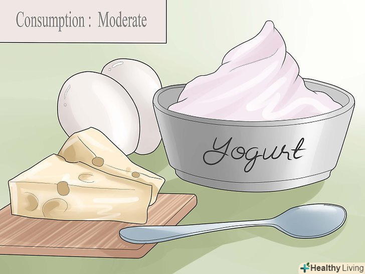 Їжте йогурт, сир і яйця в помірних кількостях. ви можете їсти йогурт, сир і яйця щодня або принаймні двічі на тиждень. Сир і йогурт містять кальцій, який необхідний для підтримки здоров'я кісток. Також вони містять протеїн, вітаміни А, D, В12, цинк і йод. По можливості купуйте йогурт і сир з низьким вмістом жиру або знежирений для обмеження споживання жирів. Яйця є чудовим джерелом протеїнів. [8]- Вживання занадто великої кількості сиру і яєць може стати причиною накопичення холестерину.