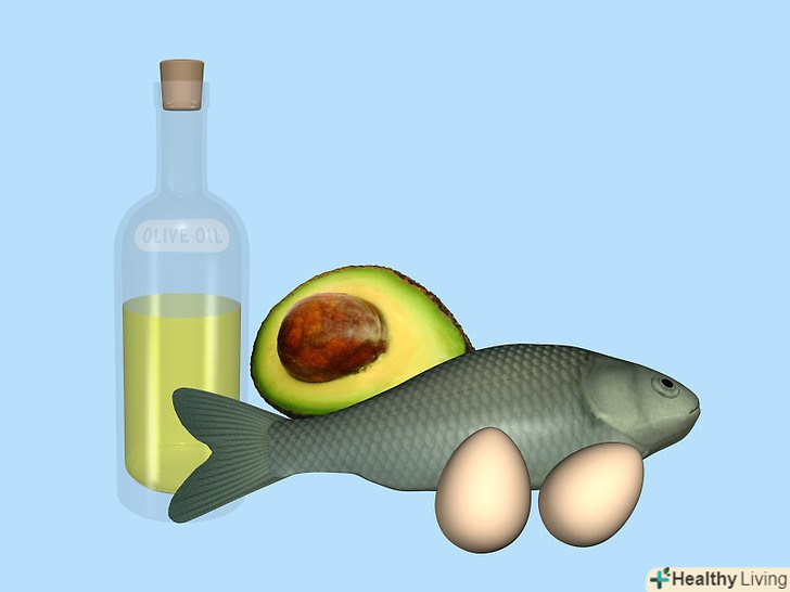 Зменшіть кількість насичених жирів в раціоні. це ті, які застигають при кімнатній температурі. Замість цього, вибирайте мононенасичені жири, які містяться в оливковій і рапсовій олії, горіхах і авокадо. Омега-3 жири також корисні. [5] ви можете знайти їх у сардинах, лососі, Омега-3 яйцях, насінні льону, насінні Чіа та волоських горіхах.- Не виключайте повністю жири зі свого раціону. Щоденне вживання калорій, корисне для серця, повинні становити приблизно 30% калорій з жирів, однак, насичених жирів має бути 7% або менше. [6]