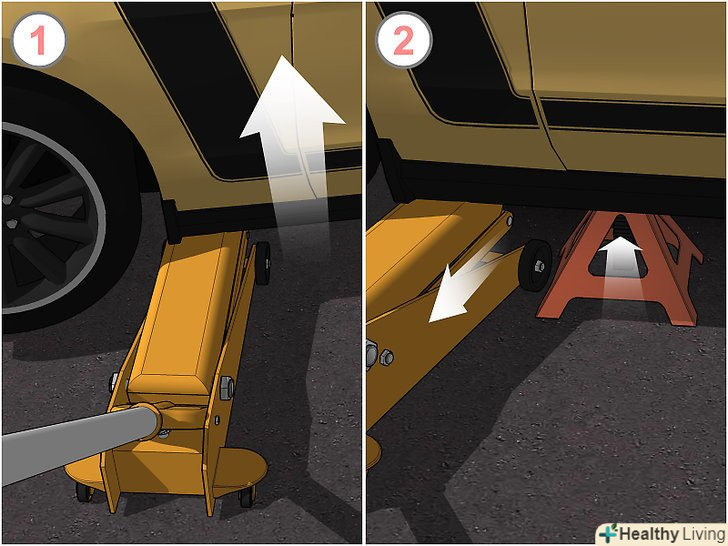 Візьміть домкрат.Ваш автомобіль укомплектований домкратом, так що ви можете за один раз замінити одне колесо. Але щоб поміняти місцями всі колеса, вам потрібно підняти над землею весь автомобіль цілком. Найпростіший і дешевий спосіб зробити це – роздобути набір опор, який коштує приблизно 30 $. НЕ намагайтеся зробити це за допомогою декількох домкратів.- Якщо ви не хочете купувати опори, то можна використовувати шлакоблоки. З іншого боку, ви можете встановити у себе в гаражі гідравлічний підйомник вартістю в кілька тисяч доларів.