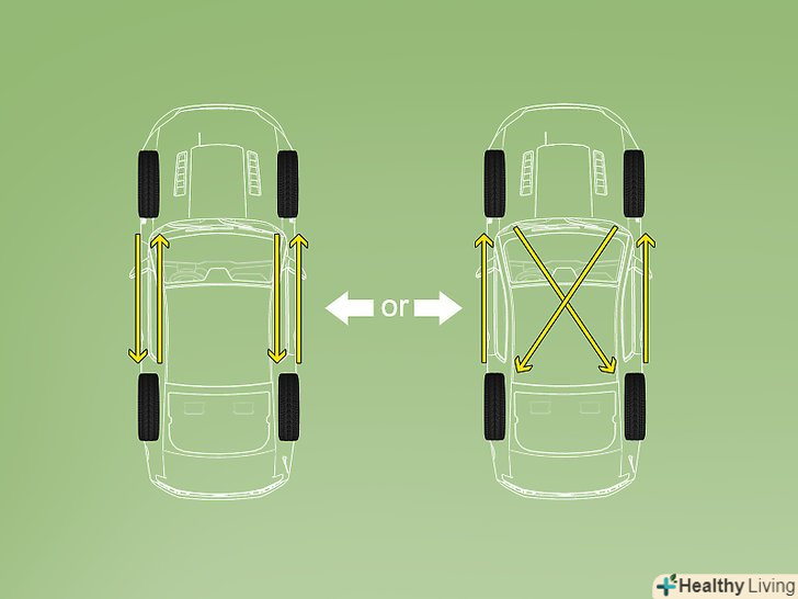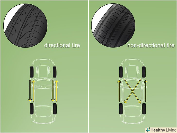 Перевірте малюнок протектора на шинах.[1] Колеса бувають спрямовані і ненаправлені. Спрямовані шини мають строго спрямований малюнок протектора, як правило, з канавками, призначеними для того, щоб відводити воду і пісок назовні, щоб поліпшити управління. З цієї причини не можна міняти місцями спрямовані шини з боку водія і шини з боку пасажира і навпаки. Ненаправлені шини виглядають однаково, і міняти місцями колеса з боку водія на пасажирські колеса абсолютно безпечно.- Для направлених шин ротація означає, що вам потрібно поміняти місцями переднє колесо з водійської сторони з заднім водійським колесом і навпаки.