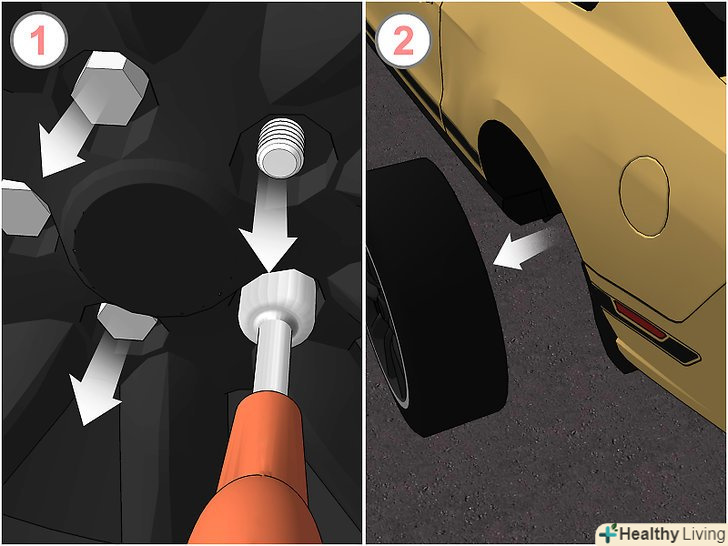 Зніміть ковпаки і послабте кріпильні болти.поки ваш автомобіль все ще на землі, використовуйте хрестовий балонний ключ і зніміть ковпаки, щоб дістатися до кріпильних болтів. Потім, за допомогою ключа послабте болти, якими колесо прикручено до осі. Не виймайте Болти, просто послабте їх трохи для того, щоб вони легко відкручувалися, коли ви підніміть машину.- Зніміть один ковпак і використовуйте його як контейнер для зберігання болтів.