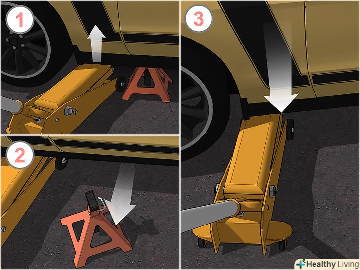Опустіть машину.за допомогою домкрата піднімайте кожну сторону автомобіля до тих пір, поки не зможете безпечно видалити опори, і потім опустіть машину. До цього переконайтеся, що достатньо закріпили колеса. Ви повинні зуміти розгойдати колесо взад-вперед.