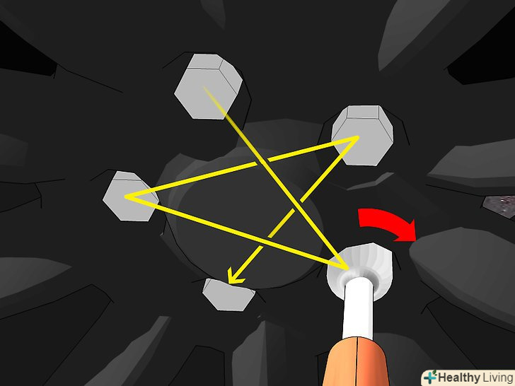 Затягніть болти, використовуючи балонний ключ.у більшій частині машин колесо кріпиться на 6 болтах. Коли ви повністю опустили машину, затягніть болти за допомогою ключа, затягнувши один болт, додавши чверть обороту, потім болт прямо навпроти першого, потім болт, що знаходиться поруч з першим, і т. д.- Якщо у вас є динамометричний гайковий ключ, ви можете використовувати його, щоб остаточно затягнути болти з певним значенням крутного моменту (згідно специфікації). Для більшості машин це 108,5-135,6 Нм. Для вантажівок – 122 – 189,9 Нм.