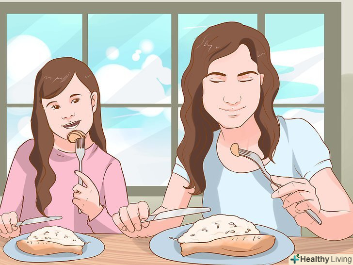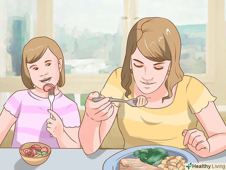 Станьте зразком для наслідування. ні для кого не секрет, що діти повторюють за батьками ще з дитинства. [2] використовуйте даний факт, щоб показувати дітям правильне ставлення до їжі і здорові звички.- Покажіть, що Вам до смаку найрізноманітніша їжа, включаючи здорові і поживні страви з пісними білками, цільнозерновими продуктами, фруктами і овочами. Якщо ви не їсте такі продукти, то і діти не стануть цього робити.