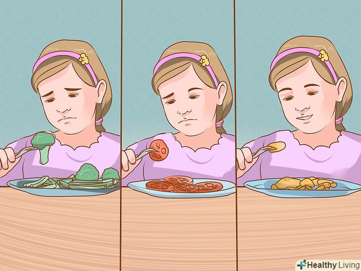 Пропонуйте різні продукти по кілька разів. діти дуже вибіркові в їжі (особливо у віці від двох до шести років), але якщо пропонувати різні корисні продукти по кілька разів, то велика ймовірність, що дитина їх розсмакує. [8]- Пропонуйте нові продукти більше одного разу. Можна готувати їх по-різному, щоб дитина звернула увагу на страви.