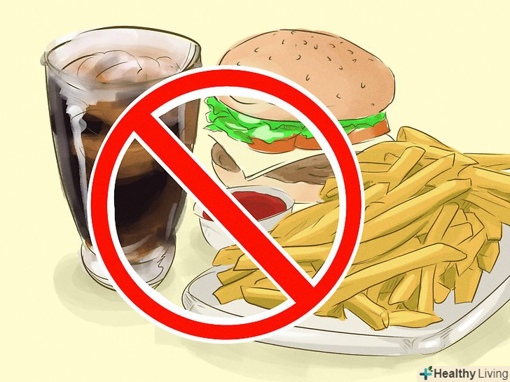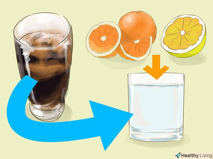 Замініть лимонад звичайною водою без добавок.через цукру в своєму складі лимонад може стати причиною ожиріння, тому дуже важливо позбутися від звички його пити (якщо вона у вас є).[14] перехід зі звичайної газованої води на дієтичну впливає на споживання калорій, проте може стримати тягу до солодкого.- Якщо звичайна вода не приносить вам повного задоволення, спробуйте додати в неї натуральні продукти.[15] вичавіть трохи соку з лимона або апельсина, щоб отримати цитрусовий напій. Замочіть скибочки огірка або шматочки полуниці в глечику з водою для освіжаючого, літнього варіанту. Або можна купити інфузор, щоб ароматизувати воду. Просто додайте фрукти в інфузор, щоб вони не змішувалися з водою.
