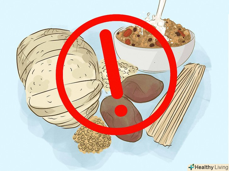 Скоротіть споживання вуглеводів.деякі люди вважають за краще повністю відмовитися від насичених цукром і вуглеводами продуктів, таких як білий рис, хліб, макаронні вироби і картопля. Якщо це здається вам занадто радикальним кроком, ви можете зберегти їх у своєму раціоні, але обов'язково споживати в помірних кількостях. Ці продукти викликають безперервну тягу до цукру, провокуючи його стрибок у вашому організмі. В результаті організм вивільняє велику кількість інсуліну, щоб впоратися з цим стрибком, і рівень цукру падає. Але через це організм починає бажати ще більше цукру, знову запускаючи цикл.[7]- Найбільш небезпечні "білі" сорти хліба, рису і макаронів. Замість простих вуглеводів включіть в свій раціон продукти, що містять складні вуглеводи, наприклад солодка картопля, кіноа і вівсянку, цільнозерновий хліб, коричневий рис і цільнозернові макаронні вироби.[8]