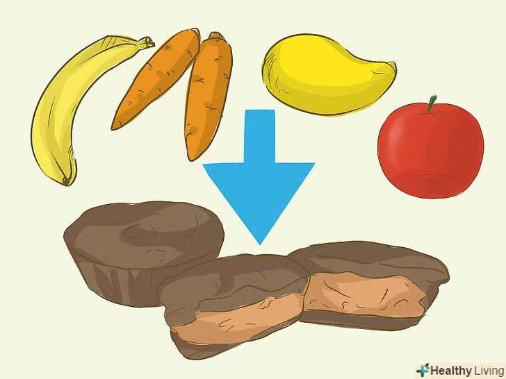 Замініть рафіновані цукру натуральними. цукор з більшості бакалійних товарів шкідливий для вашого здоров'я, проте натуральні цукри, які містяться у фруктах і овочах, йдуть укупі з іншими корисними властивостями. Замініть шоколадний батончик фруктами, які багаті поживними речовинами, наприклад, на банани і фініки. Навіть у випадку з випічкою можна замінити цукор фруктами! Використовуйте бананове пюре, печені яблука та запечену мускатну гарбуз, щоб підсолодити свої торти, домашнє морозиво або смузі.[10] багато фруктів можна запікати і використовувати в якості десерту. Наприклад, можна запекти яблуко, а потім додати корицю. Навіть у багатьох готових сумішах для тортів, печива і Брауні можна замінити деякі інгредієнти яблучним пюре, щоб знизити калорійність. Головне, обов'язково перевірте маркування з харчовою цінністю, щоб переконатися, що в яблучне пюре не доданий цукор.